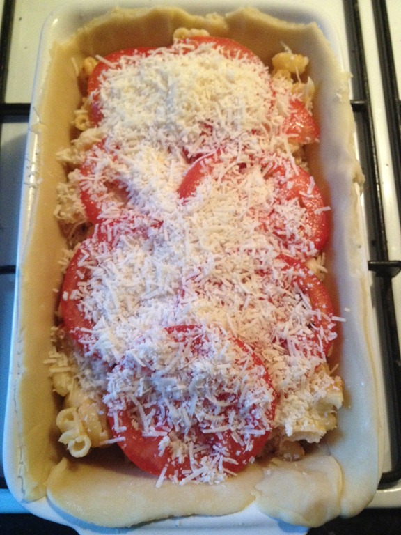 We rolled out the pastry and lined a rectangular dish, piled in the Mac ‘n’ Cheese, topped it with some lovely juicy, thinly sliced beef tomatoes, a sprinkling of parmesan (because we need more cheese). Popped on the pastry lid and cooked it in the oven for about 30 mins.
