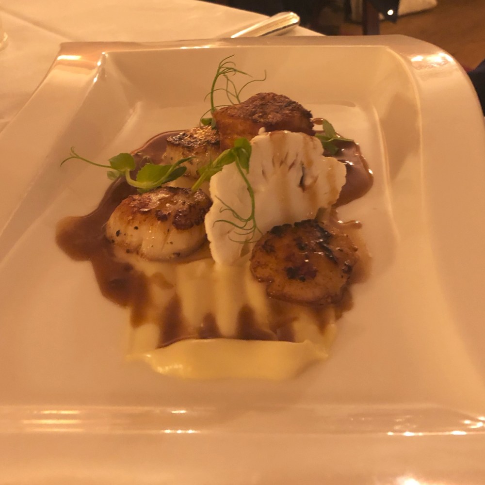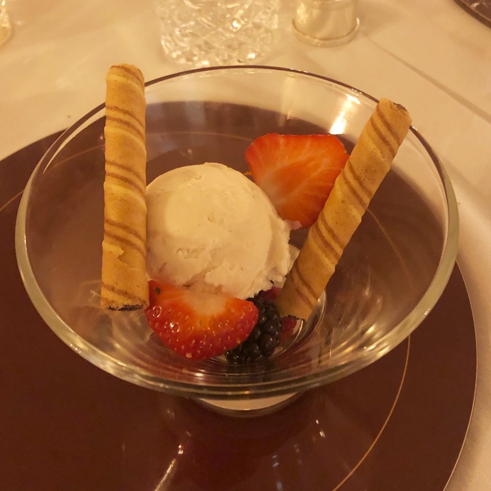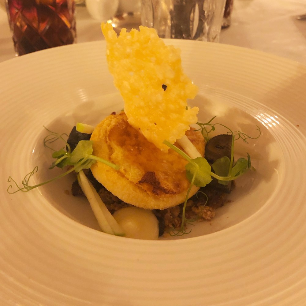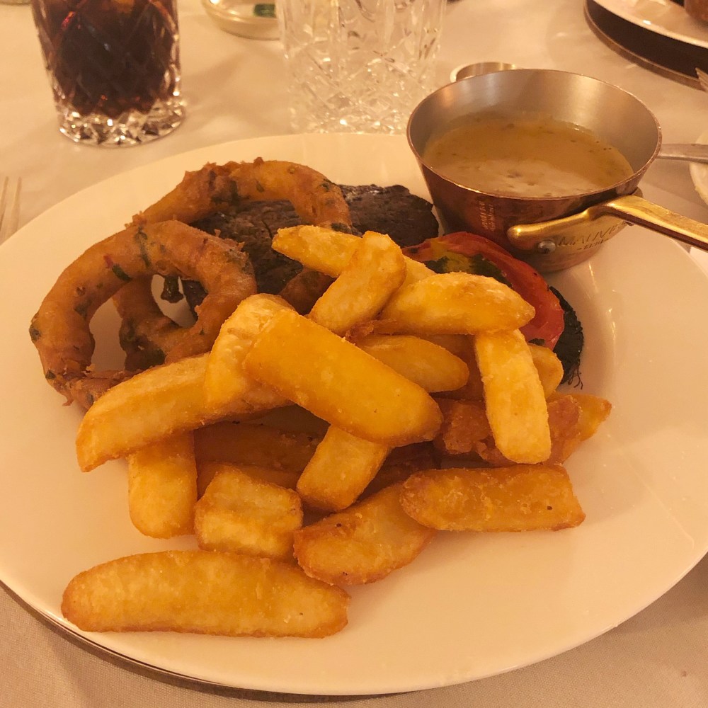 After enjoying the gin and chocolates we peeled ourselves away from our very comfortable room, downstairs to the dining room. Normally dinner is served in the clubhouse, but because of covid they were serving it in the main house. The menu gave us a lot of tasty options (but no alcohol allowed still!) . For starter we choose the Cheese Souffle and the Scallops, both delicious dishes, and light enough for a starter. For main we both had the same – Steak, chips and onion rings, and look at the size of those chips! Steak cooked to perfection and the chips were crispy and fluffy. I was the only one that managed any kind of dessert, so kept it simple with some ice cream, sometimes you just need something sweet to complete a meal!