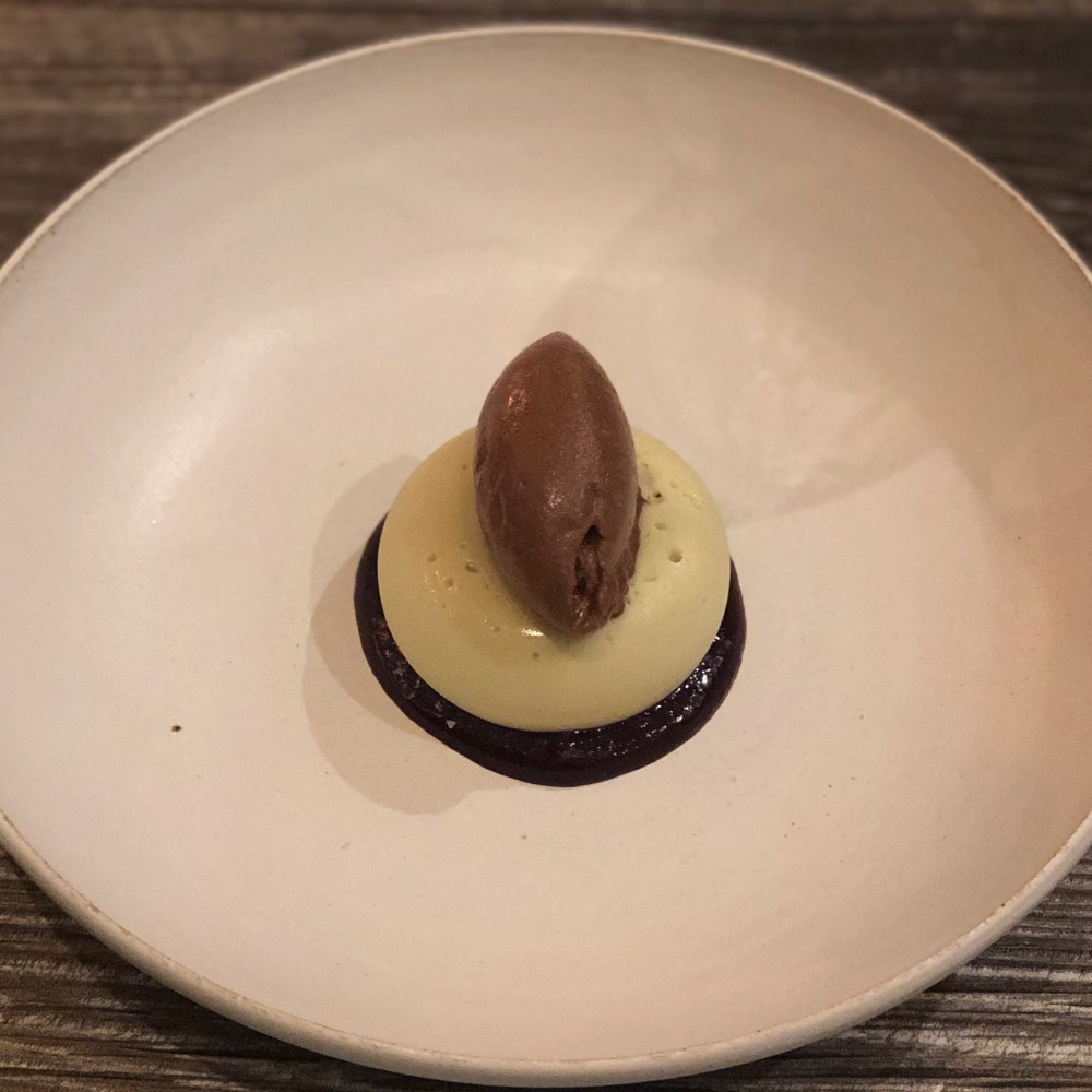 Finally for dessert, it was a mix of sweet and savoury! We went for the Potted Tunworth Cheese with Redcurrant and Seeded Cracker washed down with a Pomona Somerset Brandy. The cheese was light and creamy and the redcurrant complimented it well. Our other dessert was the Chocolate and Wild Peppermint Mousse with Blackcurrant accompanied with a Maury ‘Grenat’, Domaine Lafage dessert wine. This was delicious and sweet, chocolatey and fresh way to end the meal.