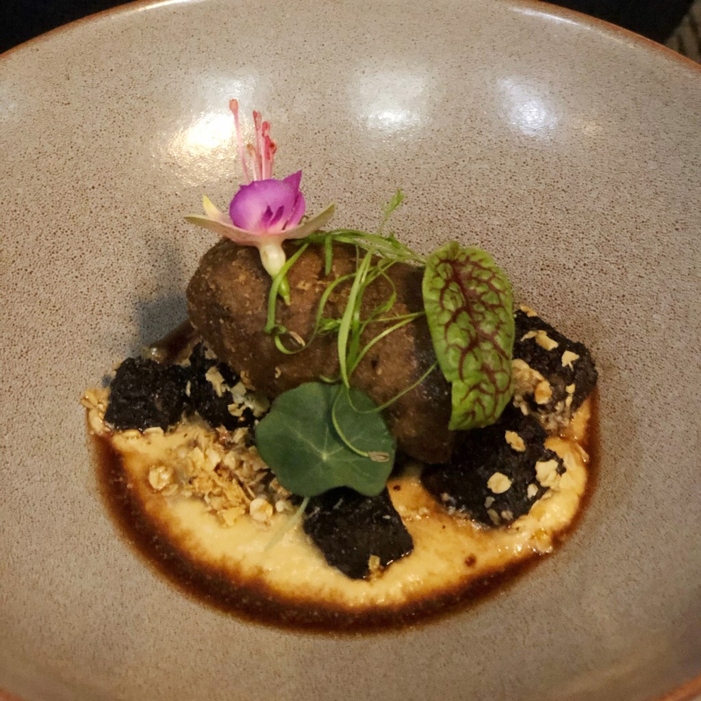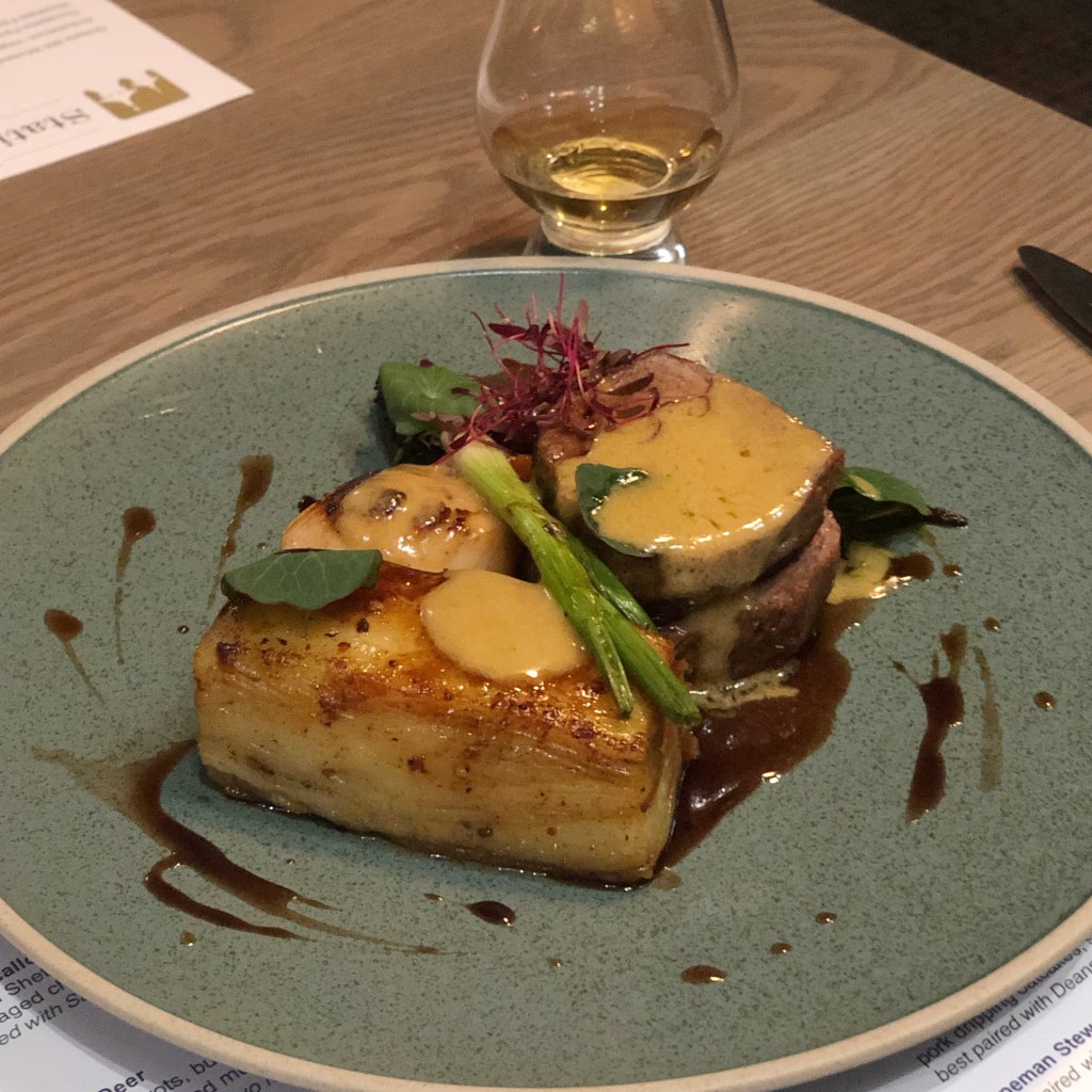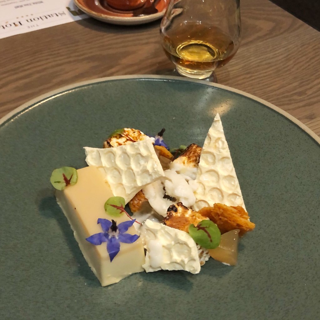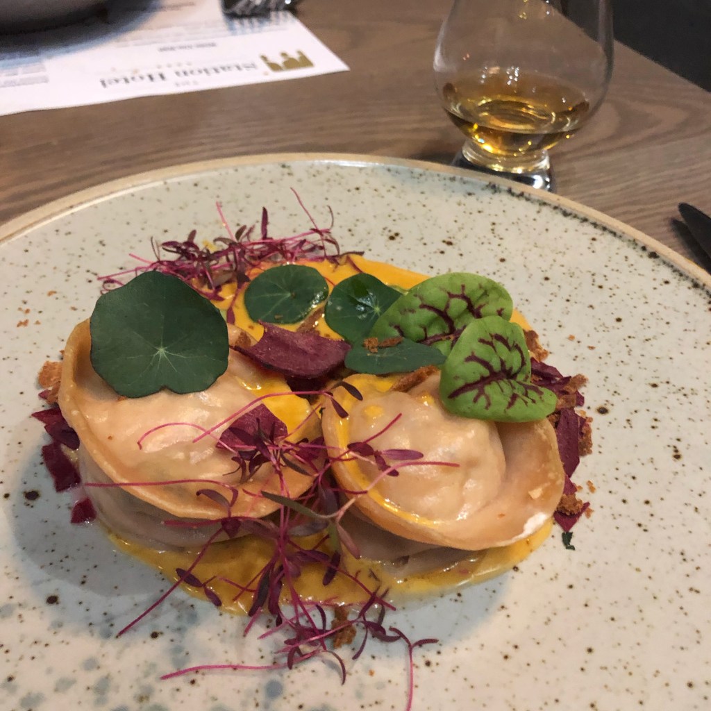 Moving onto the food, it was hard to decide as it all sounded really good, I also noticed that all the courses could come with a whisky pairing… oh well if you insist! For start my driver had the the Lower Mill of Tynet Beef Shin Croquette, Moray Black Pudding, Golspie Mill Oat Cumble, burnt onion puree, red wine jus. Which he said was meaty and delicious, and judging by the very clean plate he wasn’t lying!