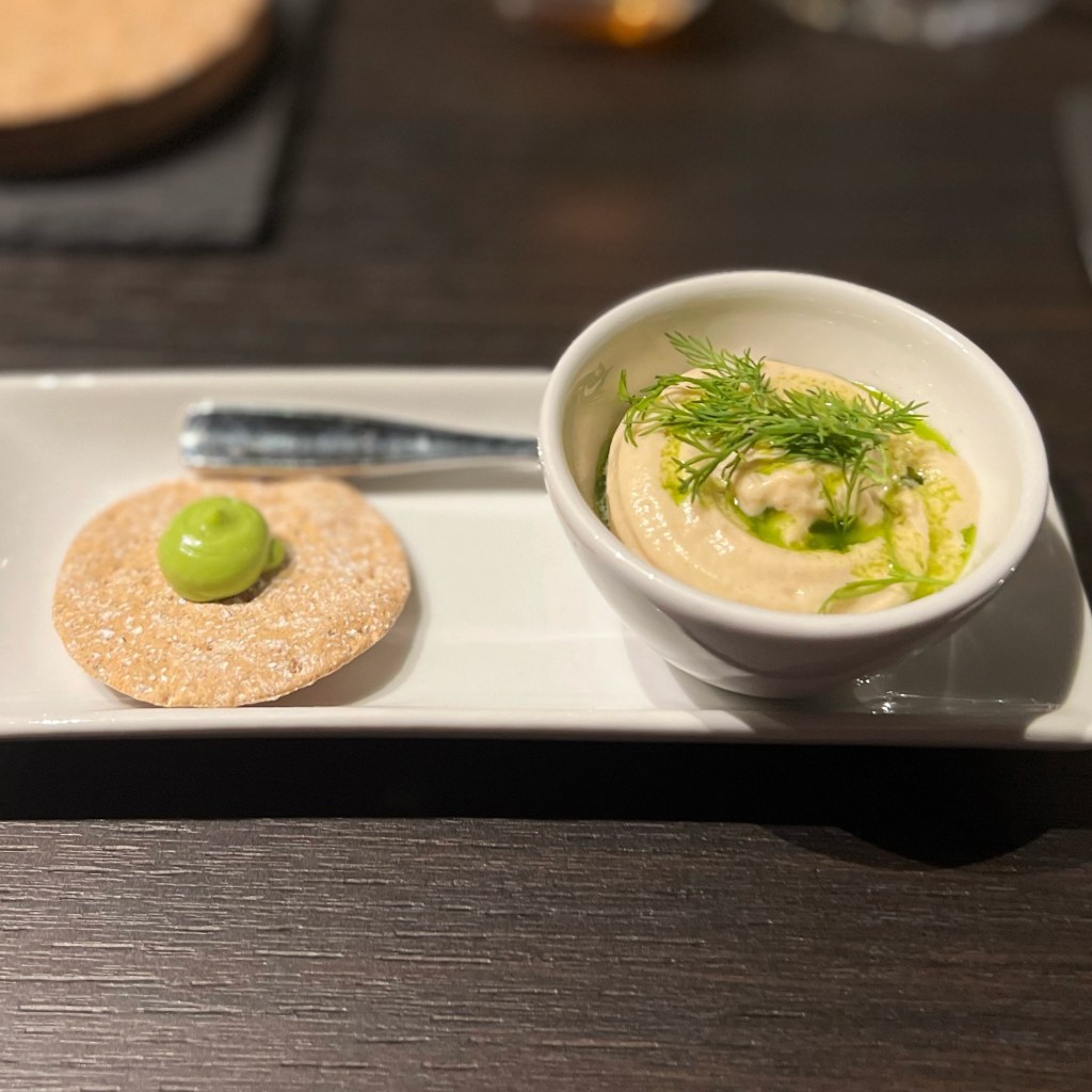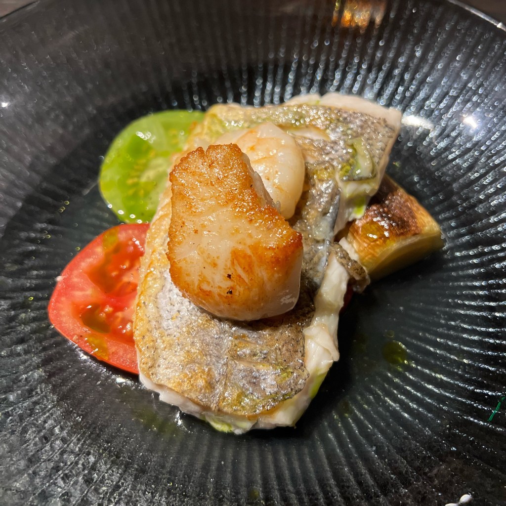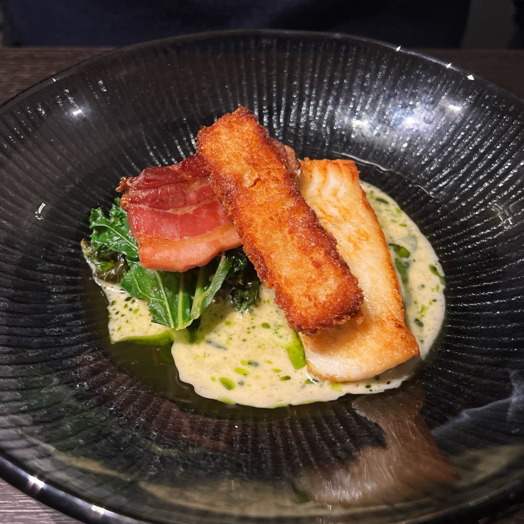 Naturally we started with a couple of cocktails, mine a Hemingway Daiquiri made with Rum, Pink Grapefruit, lime and Maraschino Liqueur, and his a Into the Woods – a take on an old fashioned with a Hazelnut infused Bourbon, Beeswax, Pine Wood Smoke and Bitters. While we enjoyed our aperitif, we were treated to an amuse bouche of mackerel pate and oatcake with wasabi, which set the bar for the rest of the meal!
