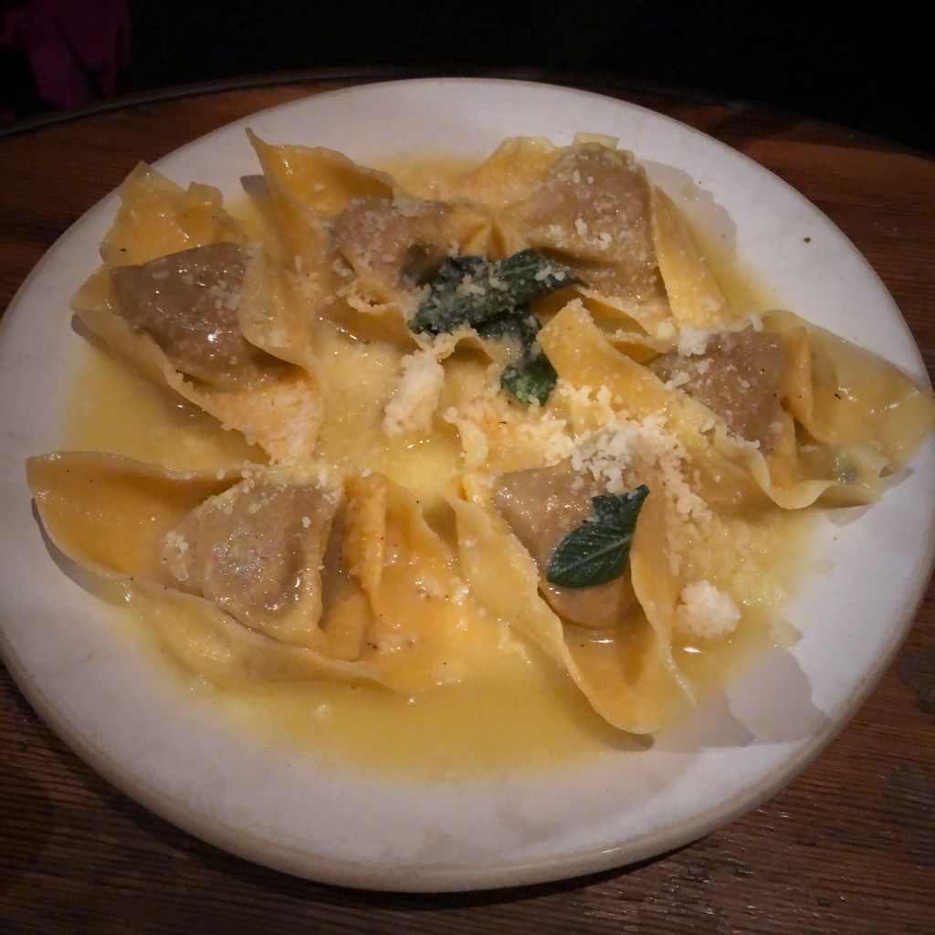For main, it had to be pasta – what else! I went for the Ravioli filled with roast sweet pumpkin and ricotto, with a sage butter, and my friend had the Tortelloni filled with Roasted Pork Shoulder and sage butter. Both dishes were sublime, simple ingredients but absolutely delicious. Soft freshly made pasta, well filled with flavoursome fillings and that rich sage butter which is so wrong but so right.