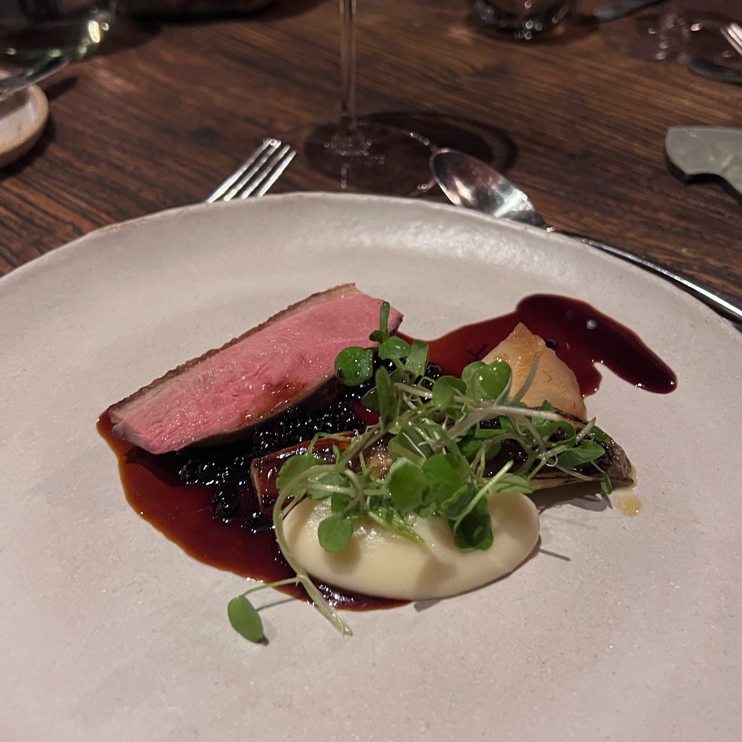Next up was a dish of North Sea Cod, Oyster Mushrooms, Mussels and Garden Greens, this was a beautifully cooked piece of Cod, which is a favourite fish of mine coupled with fresh vegetables and a tasty sauce, simple but perfect. The final savoury course was a Salt-aged Duck, Celeariac, Roasted Chicory with an Elderberry Sauce. The Duck was cooked perfectly, and was a great way to end the savoury portion of our meal.