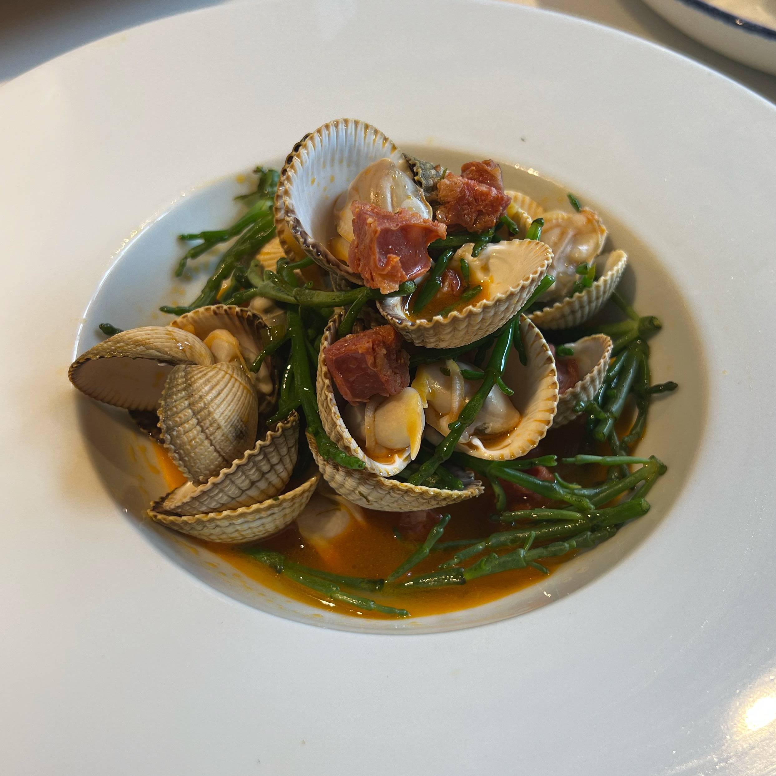 For starter I had the Tempura Squid with a Soy Dip, the batter was light, squid cooked perfectly with a tasty sauce to dip in. As usual, my husband went for a couple of Oysters to enjoy with his Martini, followed by a starter of Cockles with Pancetta and Samphire, a dish which he said was flavoursome and delicious.