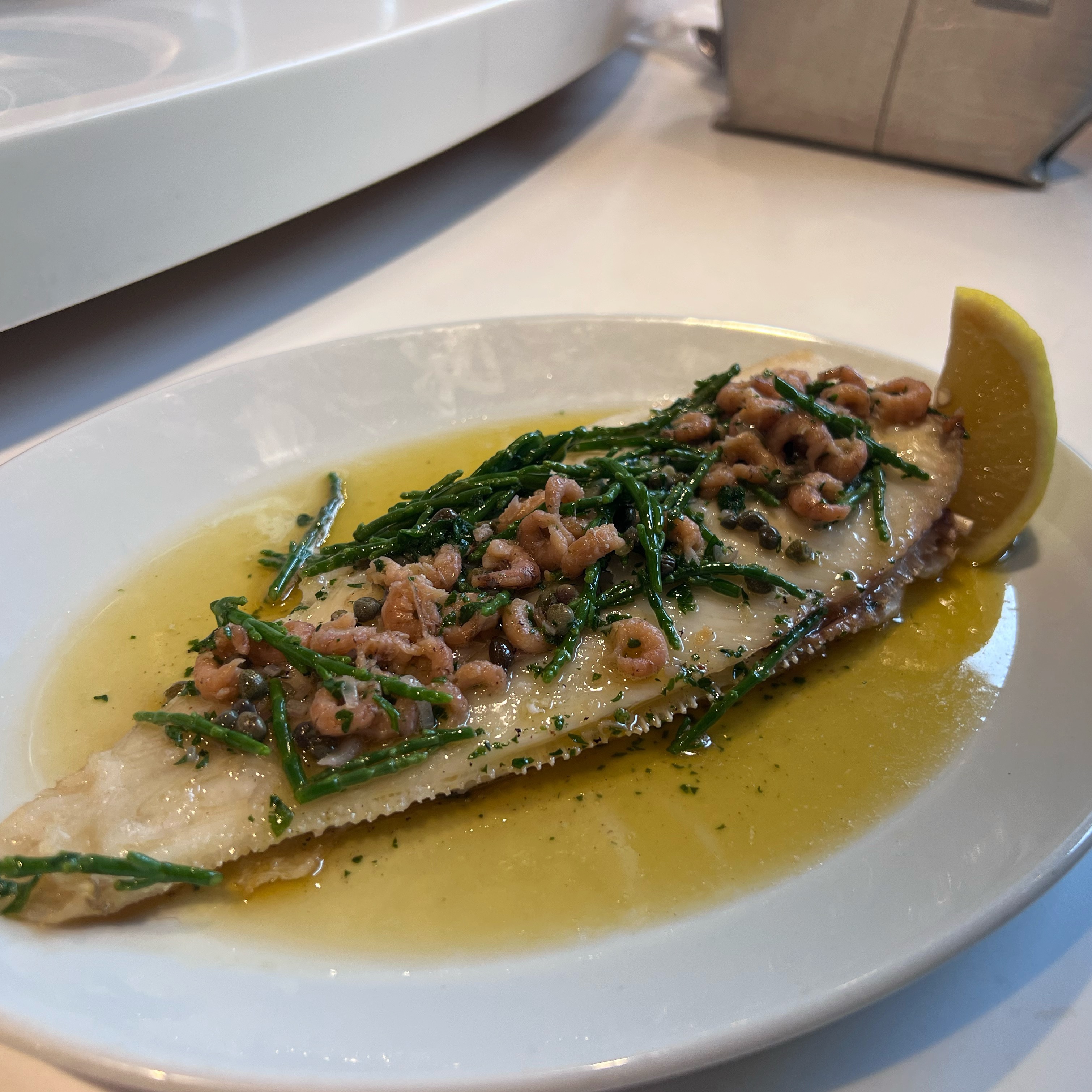 Moving on to mains, I had been eyeing up the Langostines being cooked while sipping on my cocktail at the counter, so I knew that was exactly what I was going to have. Meaty, juicy Langostine covered in a Garlic Butter, what’s not to like? Especially with a side of chips to dip in the buttery goodness! The other main was a Lemon Sole with Brown Shrimp Butter and Samphire, melt in the mouth fish, with a delicous buttery sauce, definitely not a health food!