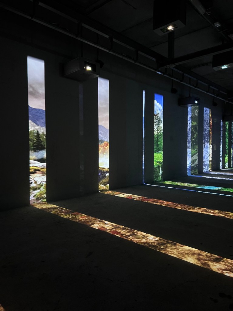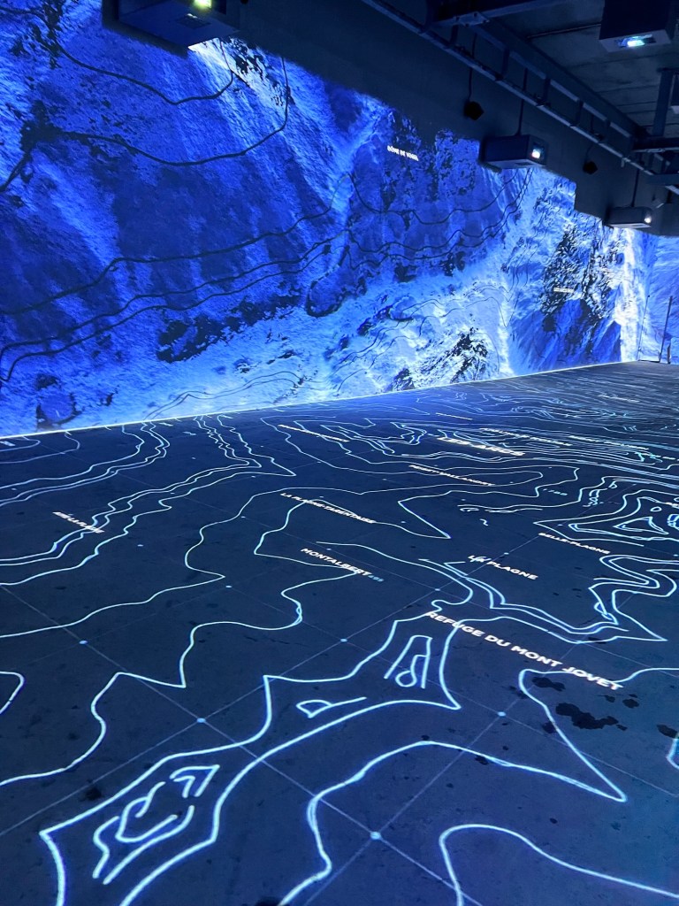 From the bus stop, you walk through the resort and head down the side of the piste in front of the Hotel Taj-I Mah and up to the Varet Gondola. The Varet gondola takes you to the Illuminated Murals of the Aguille Rouge, housed in a former ski lift garage and is an audio visual installation of Les Arcs throughout the seasons. The video lasts around 10 mins, and is worth the visit, it is free entry. Also here is a great cafe with good views for a warm drink.